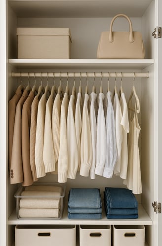Le grucce fanno la differenza: sceglile tutte uguali, meglio sottili in velluto chiaro — eleganti, salvaspazio, e perfette per non lasciare pelucchi sui capi chiari, soprattutto quelli estivi. Evita quelle nere: possono rovinare l'effetto pulito.