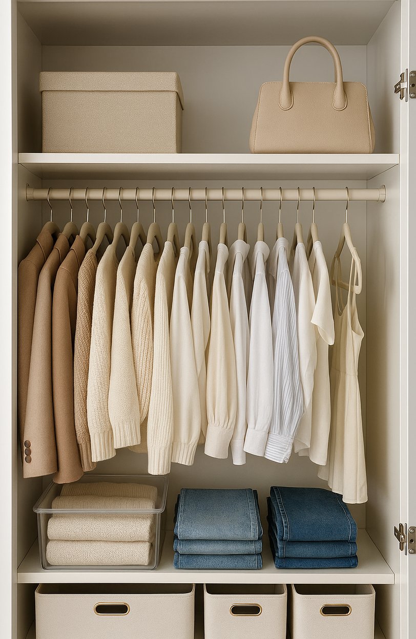 Togli tutto. Sì, proprio tutto. Appoggia ogni capo su una superficie pulita e ariosa: il letto, una panca, anche il pavimento se è comodo. Approfitta per pulire ogni angolo dell’armadio e inserire dei profumatori tessili leggeri (lavanda, talco, lino fresco). Iniziare con uno spazio neutro e profumato fa già metà del lavoro.